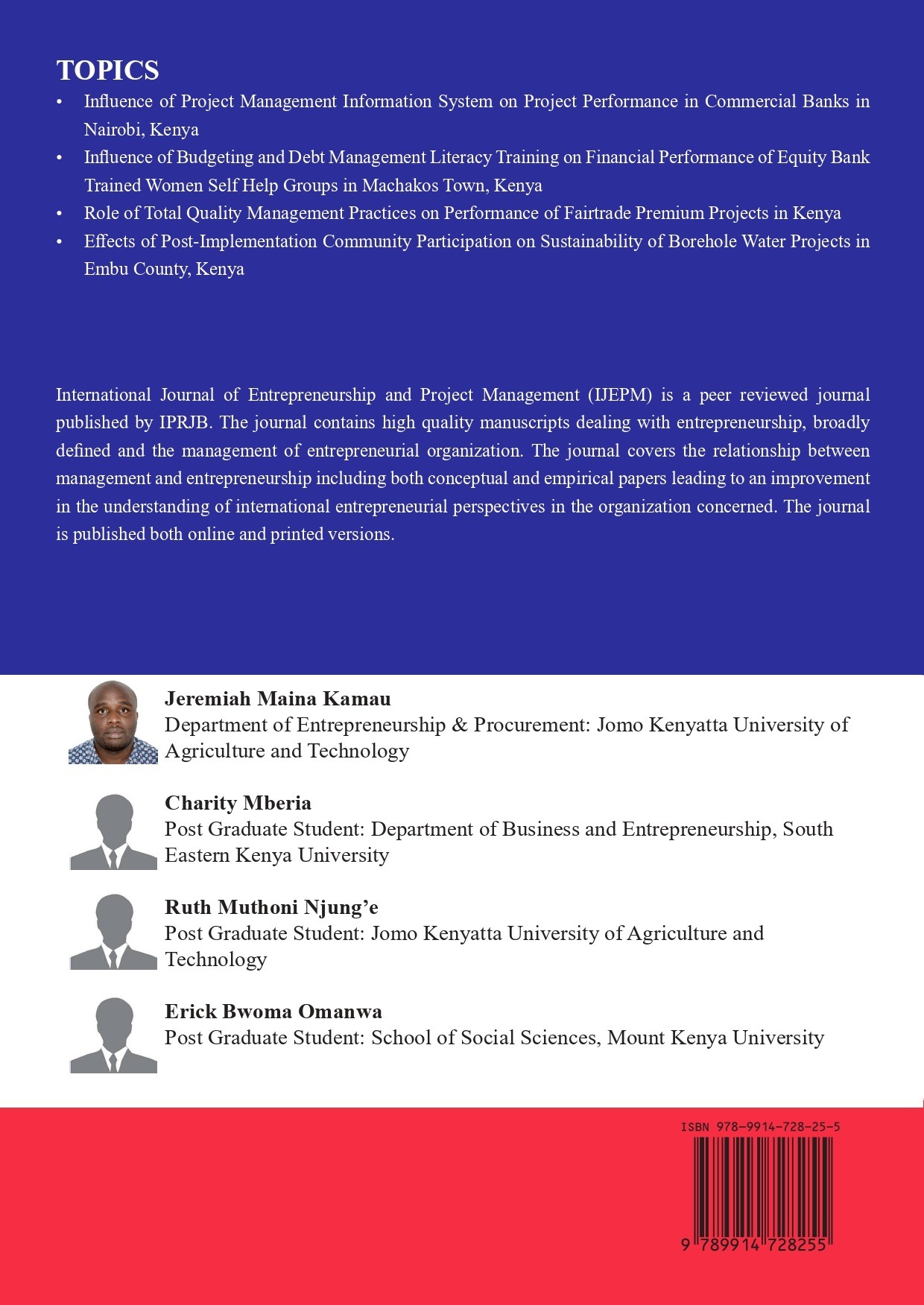 | Authors: | Jeremiah Maina Kamau, Charity Mberia, Ruth Muthoni Njung’e, Erick Bwoma Omanwa |